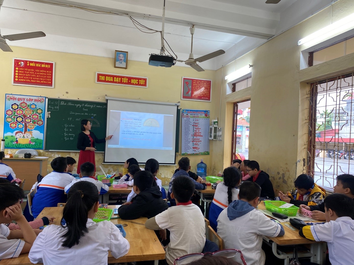 Hoạt động thứ nhất, HS được làm quen với đơn vị đo góc. Đây là kiến thức mới được đưa vào chương trình toán lớp 5 theo Công văn 3799/BGDĐT “Dạy học nhằm giúp HS tiếp cận chương trình giáo dục phổ thông 2018”. Trong tiết dạy giáo viên đã kết hợp từ kiến thức lớp 4 sang nội dung bài. Đồng thời sử dụng triệt để đồ dùng của HS (thước đo độ) để HS tự tìm tòi, phát hiện ra góc đo độ trên thước đo độ. Với sự vận dụng linh hoạt các phương pháp dạy học tích cực kết hợp đồ dùng dạy học trực quan và ứng dụng CNTT hiệu quả, GV đã giúp HS biết được đơn vị đo góc là độ, biết đo và vẽ góc 1 cách chính xác.