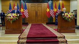 - Báo chí quốc tế cũng dẫn lời Tổng thống Joe Biden khẳng định Việt Nam là “một đối tác quan trọng trong một thời điểm quan trọng”, “hai nước có vô vàn cơ hội hợp tác” trong trao đổi với Tổng Bí thư Nguyễn Phú Trọng; khẳng định những nỗ lực của hai nước vượt qua “quá khứ đau thương do chiến tranh gây nên” tại buổi phát biểu chung với báo chí sau Hội đàm, dẫn lời Tổng thống Joe Biden nhấn mạnh mục đích của chuyến thăm “không nhằm tuyên bố “chiến tranh lạnh” hay làm tổn thương Trung Quốc” mà là để đóng góp vào ổn định của khu vực và thế giới thông qua việc củng cố quan hệ với Việt Nam và các nước ASEAN.