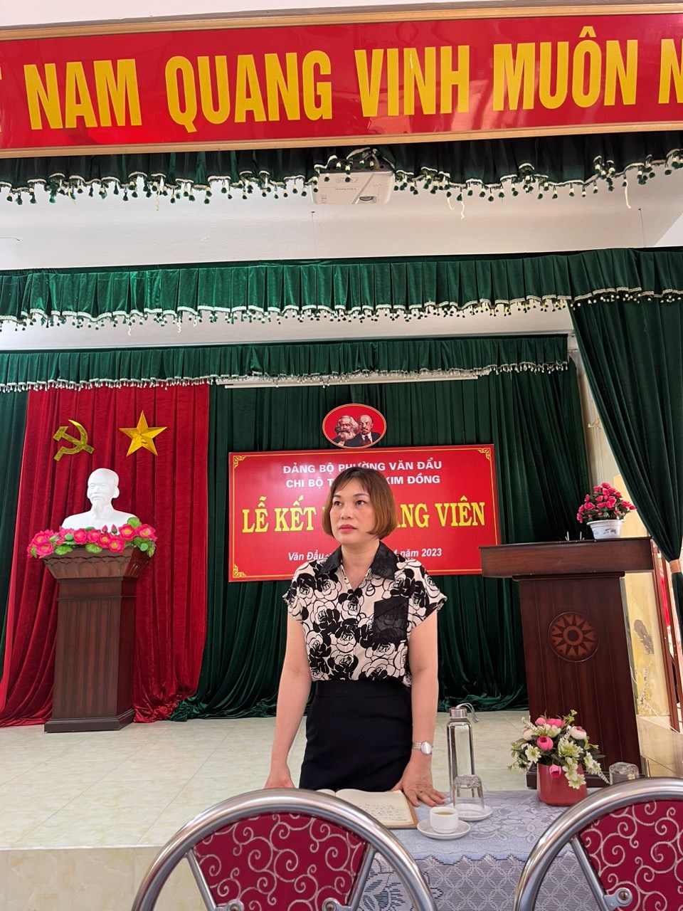 Phát biểu tại Lễ kết nạp Đảng viên Đồng chí Trần Thị Thanh Thu –Bí thư Chi bộ đã phân công nhiệm vụ cho đảng viên mới và chúc mừng đồng chí Đặng Thị Hồi và Hà Thị Mai Phương, sau một thời gian được bồi dưỡng, thử thách đã được vinh dự đứng trong hàng ngũ của Đảng Cộng sản Việt Nam.