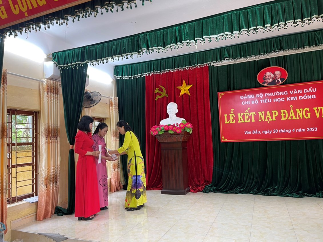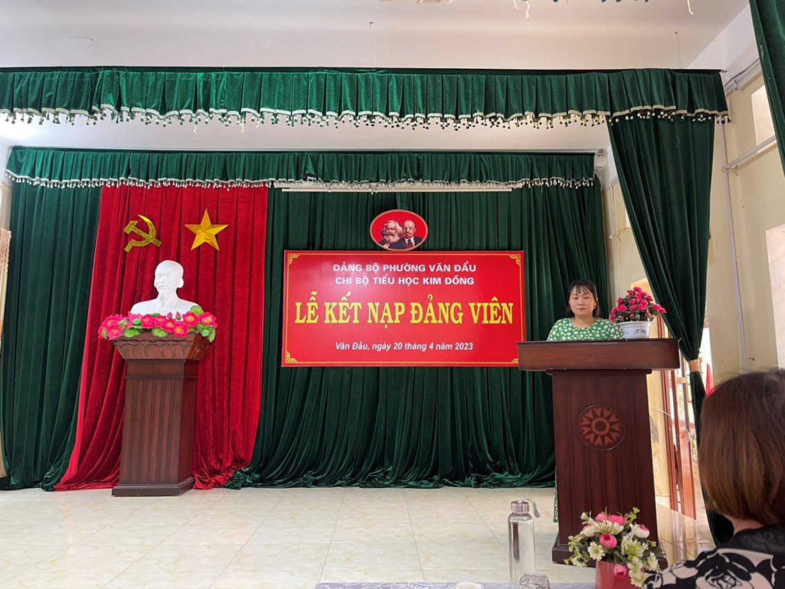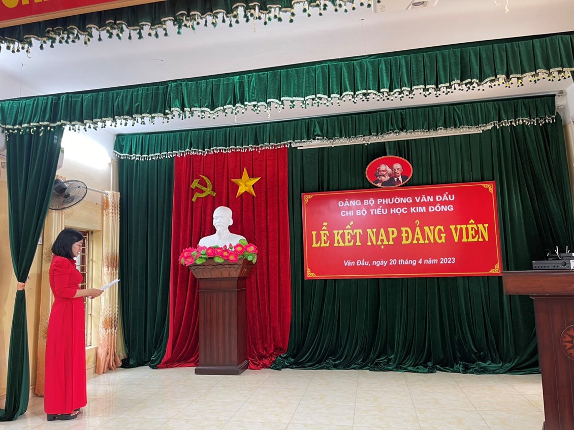 Đây là sự kiện có ý nghĩa quan trọng trong công tác xây dựng Đảng, góp phần phát triển, nâng cao chất lượng và sức chiến đấu của Chi bộ trường nói chung và các cá nhân Đảng viên nói riêng. Về dự với buổi Lễ kết nạp đảng viên của chi bộ có đ/c Nguyễn Thị Thu Trang - Bí thư Đảng bộ phường Văn Đẩu; đ/c Phạm Anh Tuấn - Bí thư Đoàn TNCS HCM phường Văn Đẩu; các đ/c tổ trưởng tổ chuyên môn, các đ/c quần chúng ưu tú các đồng chí đảng viên trong chi bộ tiểu học Kim Đồng về dự đông đủ.