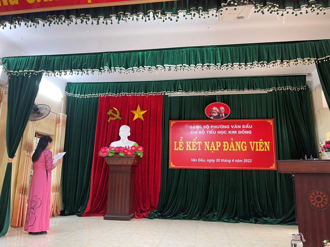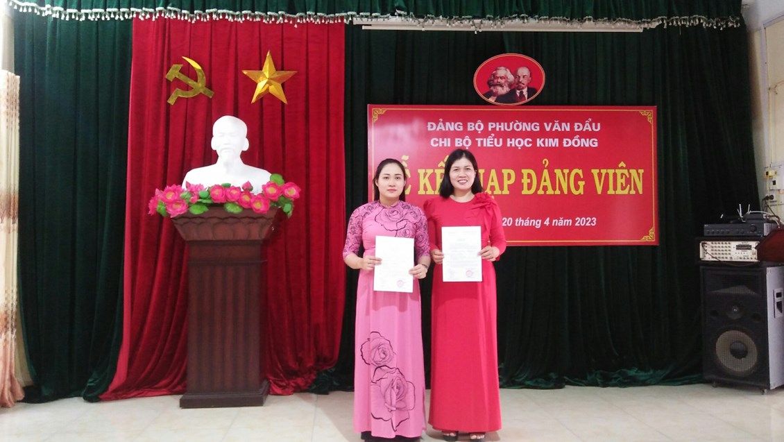 Thực hiện Nghị quyết Đại hội Chi bộ Trường tiểu học Kim Đồng về việc phát triển Đảng viên. Ngày 20 tháng 4 năm 2023, Chi bộ trường Trường tiểu học Kim Đồng đã long trọng tổ chức lễ kết nạp Đảng viên mới đối với 02 quần chúng ưu tú: Đặng Thị Hồi và Hà Thị Mai Phương. Được chi bộ xét và đề nghị với Đảng ủy cấp trên, quần chúng Đặng Thị Hồi đã được Ban Thường vụ Quận ủy Kiến An ra quyết định kết nạp vào Đảng Cộng sản Việt Nam số 783-QĐ/QU; quần chúng Hà Thị Mai Phương đã được Ban Thường vụ Quận ủy Kiến An ra quyết định kết nạp vào Đảng Cộng sản Việt Nam số 784-QĐ/QU ngày 03/4/2023.