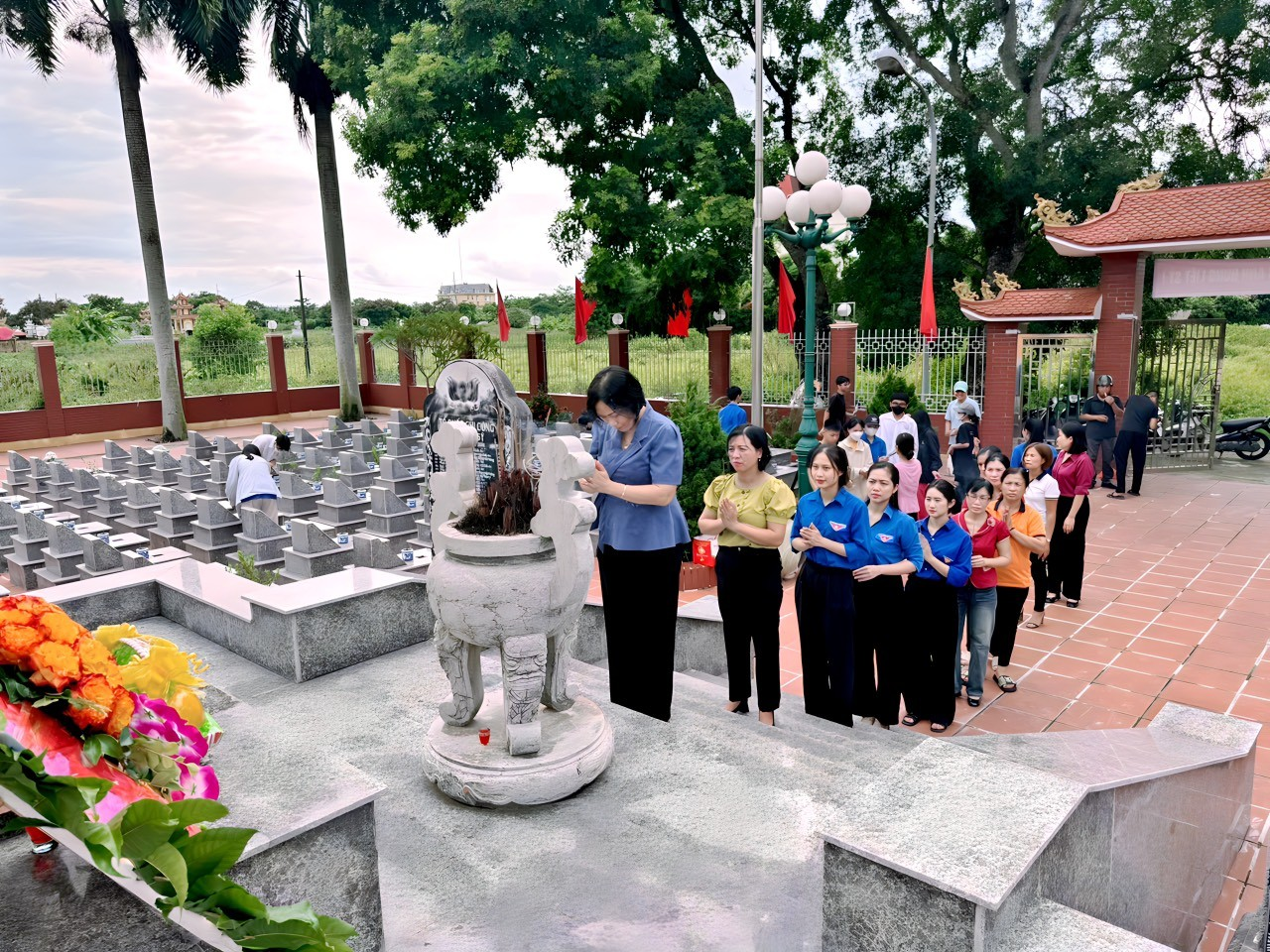 🌿 🌿 🌿 Chiều ngày 24/7/2024, cán bộ quản lí, giáo viên, đoàn viên thanh niên trường TH Kim Đồng kết hợp cùng Đoàn thanh niên phường Văn Đẩu đã có mặt tại Nghĩa trang Liệt sĩ Phường Văn Đẩu để tiến hành dọn dẹp, dâng hương và đặt vòng hoa tưởng niệm. Buổi dâng hương diễn ra trong không khí trang nghiêm xen lẫn niềm xúc động tự hào. Với lòng biết ơn và tưởng nhớ sâu sắc đến công lao to lớn của Chủ tịch Hồ Chí Minh cùng các anh hùng liệt sĩ đã anh dũng hi sinh vì nền hòa bình thống nhất đất nước, toàn vẹn lãnh thổ và độc lập dân tộc, mỗi Đoàn viên đã dâng lên các anh hùng liệt sĩ những nén nhang thành kính. Thời chiến đã qua, mỗi một mảnh đất, địa điểm đều ghi dấu những chiến công oanh liệt của những người con ưu tú Kiến An đã anh dũng hi sinh cho sự nghiệp đấu tranh giải phóng dân tộc.
