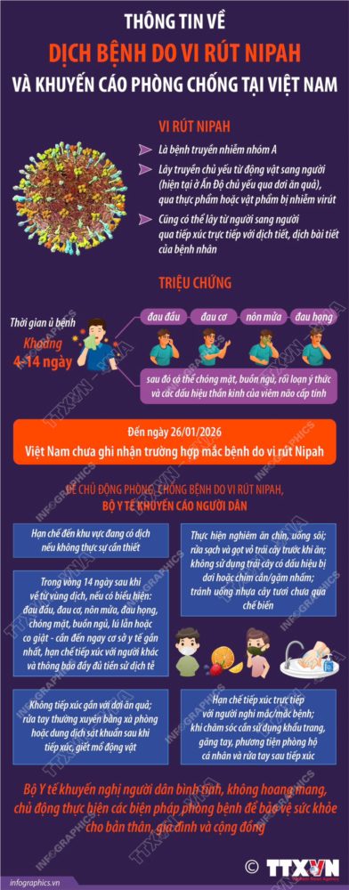 Hiện nay, tại Việt Nam chưa ghi nhận trường hợp mắc bệnh do vi rút Nipah. Tuy nhiên, để chủ động phòng bệnh, mỗi người cần thực hiện tốt các biện pháp bảo vệ sức khỏe hằng ngày.